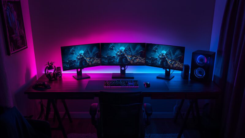 The Studioさんのデスク環境は、実用性と美しさを兼ね備えた構成になっています。モニターの配置やデスク上のアクセサリー、照明の使い方など、細部にまでこだわりが感じられるセットアップです。