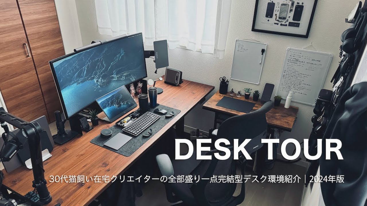 この動画はデスクツアーというよりも、ツヨシさんが実際に使い込んで厳選した便利グッズのまとめ動画です。FlexiSpotの電動昇降デスクをベースに、HHKBキーボードの無刻印キーキャップやMXErgoの替えボール、elago MagSafeトレイなど、既存のガジェットをさらに使いやすくするカスタマイズアイテムが中心。UGREEN Nexode 300Wの大容量充電器やCrucial製SSD、Kingston SDカードリーダーなどのPC周辺機器も充実しています。スタンディング時のSkySolutionsマットや、スチール製フットレストなど、長時間作業の快適さを追求したアイテムも紹介されています。